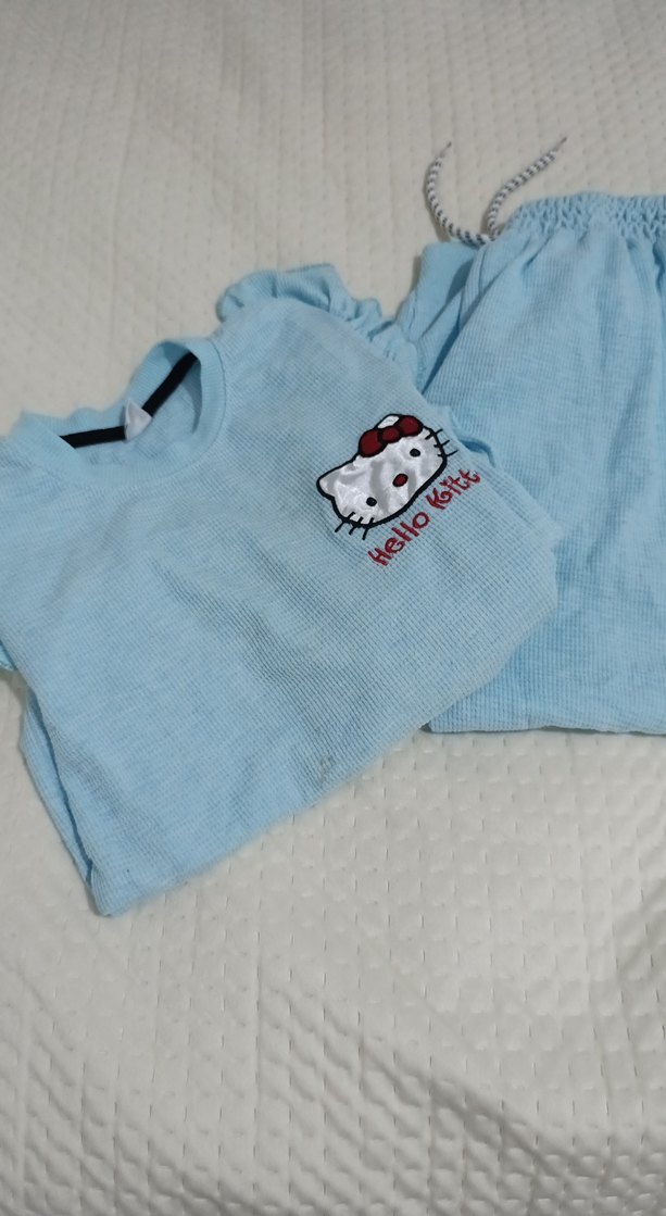 Nakışlı Hello Kitty desenli, pastel mavi ikili takım fotodakı gıbıdır ufak bı lekesı var çıkmıyo onun dısında sorunsuz
