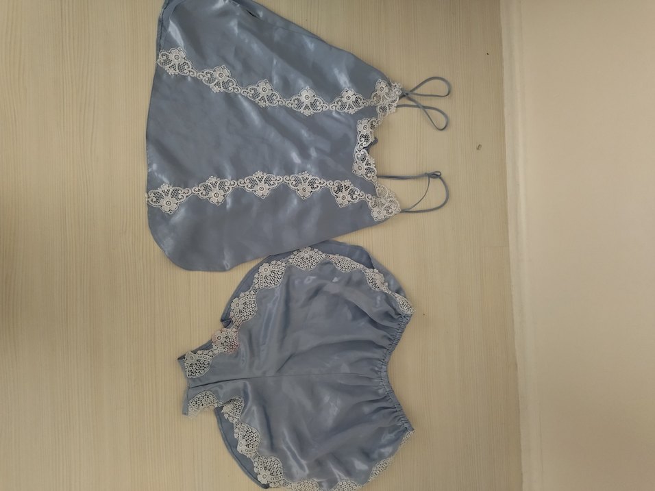 Gevşek kesim, ip askılı mavi pijama takımı, nakışlı dantel detaylarla süslenmiş kısa mini boyda, vintage bohem tarzda. m beden saten gecelik takım