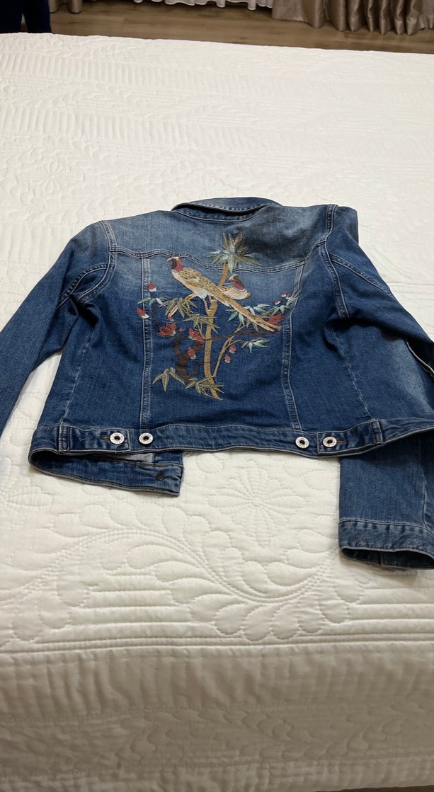 Nakışlı kuş ve çiçek desenli, düğmeli, uzun kollu, mavi, fitted kesim kadın denim ceket. Normal boy ve notched lapel yakaya sahip, günlük kullanıma uygun.