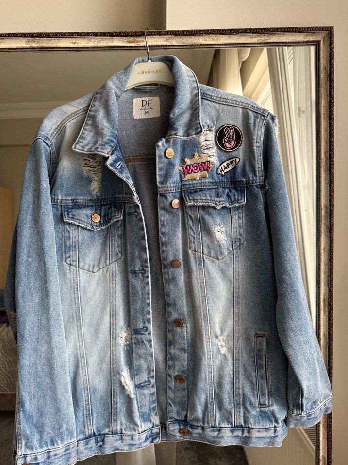 Uzunluk 68cm. Düğmeli, bol kesim mavi denim ceket, yakasında nakışlı işlemeler ve notalı yaka detayı ile trend sokak stili sunar. Uzun kollu ve midi boyda, günlük kullanıma uygun.