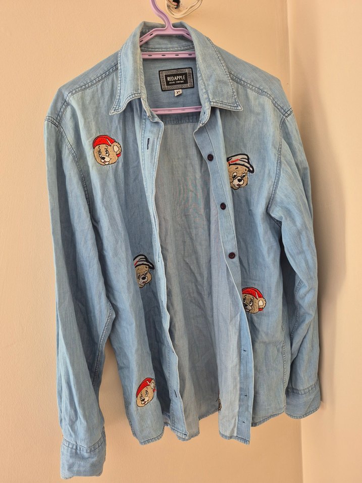 Pastel mavi renkte, uzun kollu ve notched yaka detaylı, düğmeli, nakışlı desenlere sahip bol kesim kadın denim cekettir.