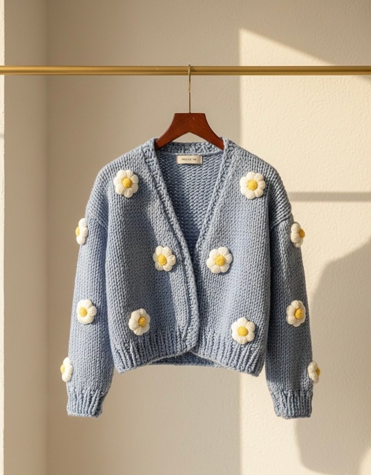 Mavi renkte nakışlı çiçek detaylı, uzun kollu, bol kesim triko hırka. Yuvarlak yaka ve rahat bohem tarzıyla günlük kullanıma uygun.