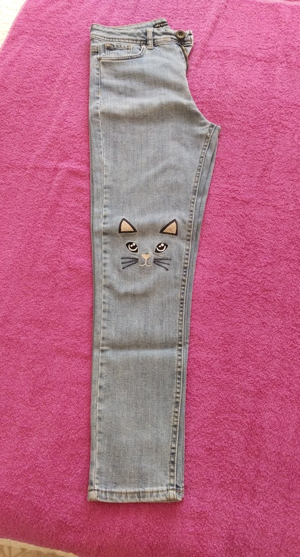 Nakışlı kedi yüzü detaylı, tokalı mavi denim jean pantolon. Normal boy ve regular fit, günlük sokak tarzı için uygun.