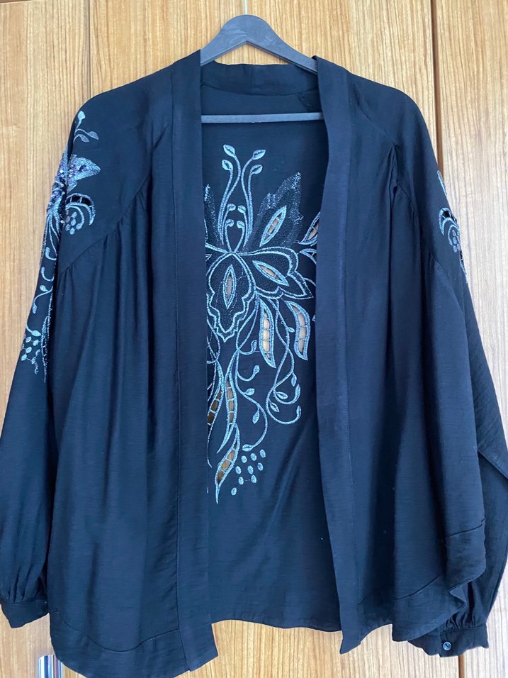 Nakışlı çiçek desenleriyle uzun kollu, bol kesim, drapeli mavi kadın kimono. Askısız yakalı ve midi boyda, ipeksi kumaştan, bohem tarzda.