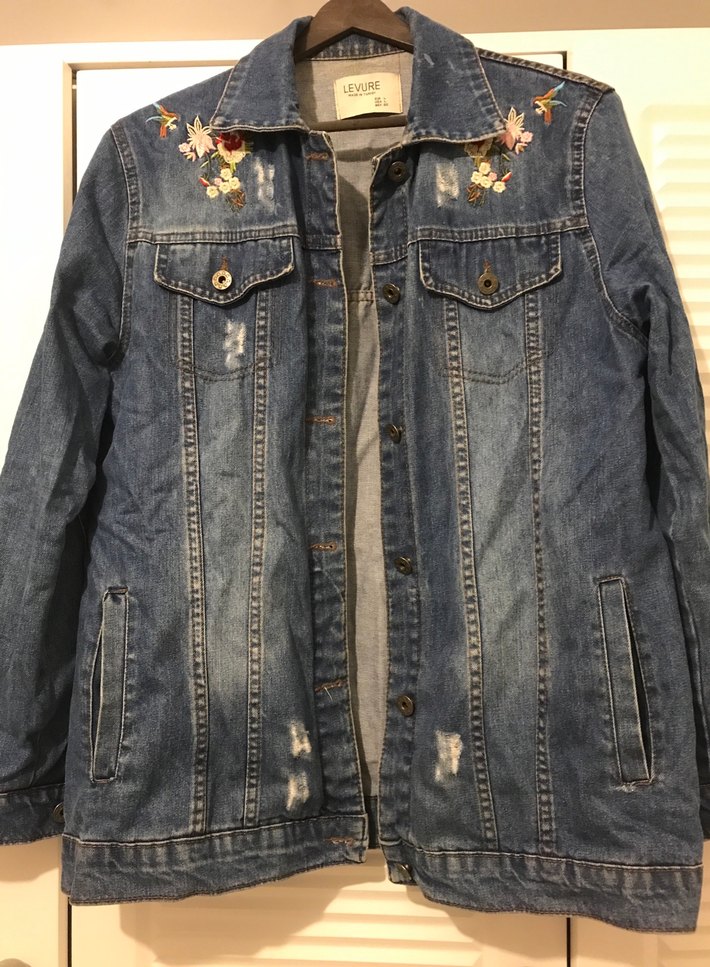 Mavi denim, düğmeli, bol kesim, omuzlarda nakışlı çiçek detaylı. Notlu yaka ve uzun kollu, günlük rahat kullanım için uygun.