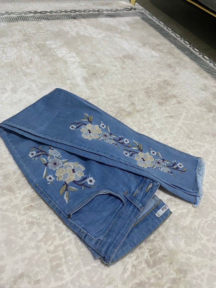 Mavi kot kumaştan, nakışlı çiçek desenli, regular fit kadın pantolon. Fermuarlı detaylara sahip, bohem tarzıyla günlük kullanıma uygun.
