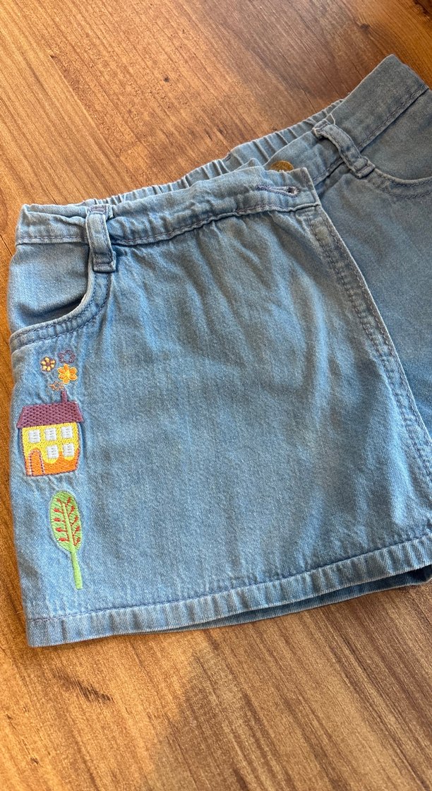 Rahat kesimli, düğmeli, nakışlı ev ve ağaç desenli mavi kot şort, bohem tarzda rahat kullanım için uygun.