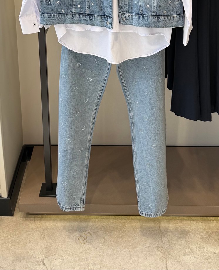 Nakışlı kalp desenli, düğmeli mavi kot pantolon, günlük rahat sokak stili için uygun. 26 - 32 beden aralığı mevcut.