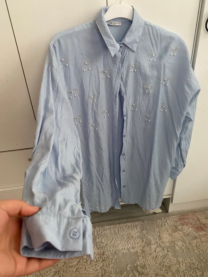 Bol kesim, uzun kollu mavi keten gömlek. Düğmeli ve yakalı, nakış detaylarıyla sokak stiline uygun rahat bir parça. Günlük kullanım için ideal. Sıfır ürün etiketi yok sadece xl bedene de olur