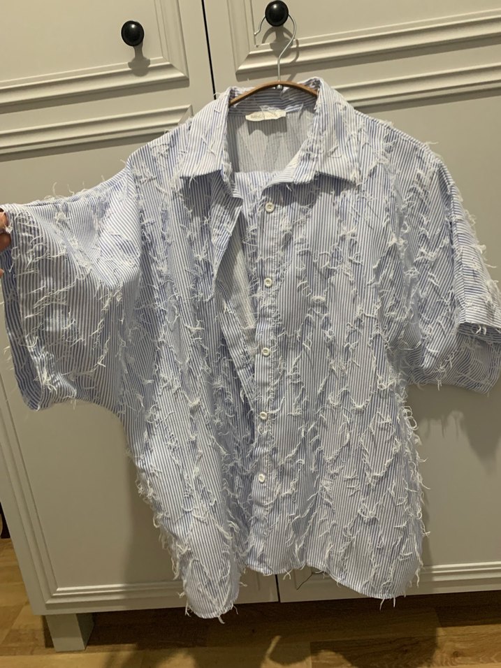 Mavi keten kumaştan kısa kollu, yakalı ve nakış detaylı kadın gömleği. Düğmeli ve bol kesim, günlük kullanıma uygundur. Şortlu gömlek takım s-m beden için uygundur