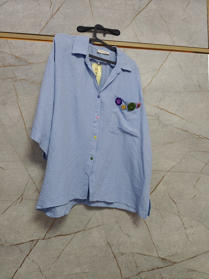 Rahat kesim mavi keten mini gömlek, kısa kollu ve yaka detaylı. Renkli düğmeler ve göğüs ceplerinde çiçek nakışı bulunur. marka temsilidir