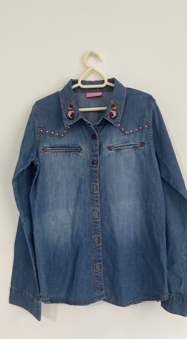 Düğmeli, uzun kollu mavi denim gömlek, yakasında nakış detaylı, notched lapel yaka ve günlük kullanım için regular fit.