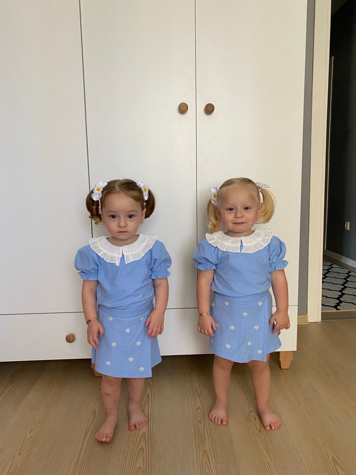 Pamuklu, rahat kesim mavi kız çocuk eteği, nakışlı desenlerle pastel tonlarda. Basit ama şık bir görünüm için uygundur.