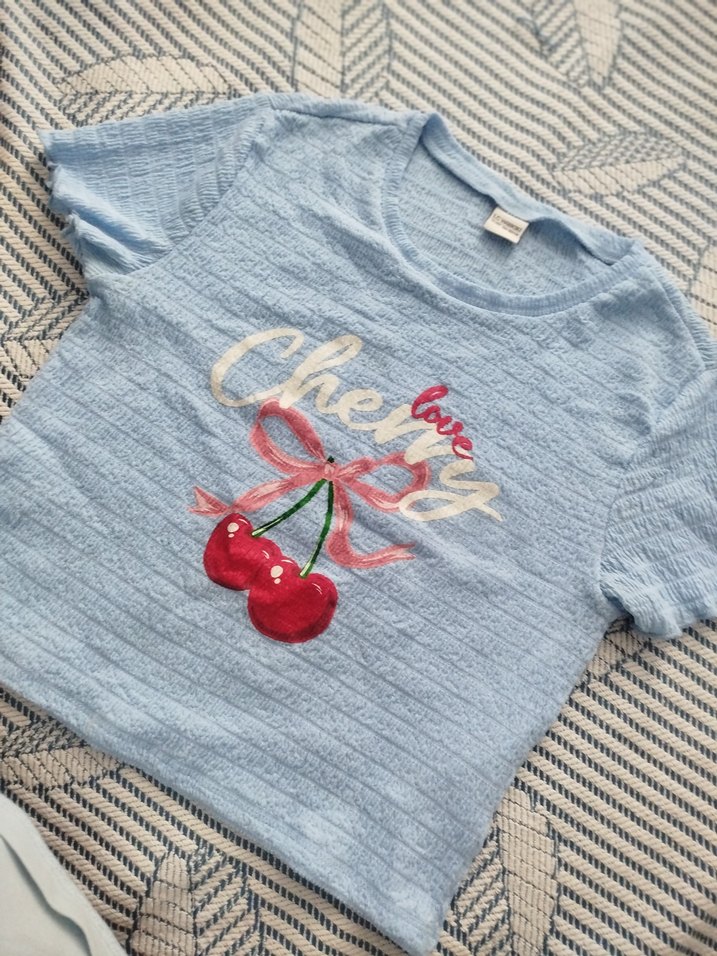 Fitted kesim, kısa kollu, bisiklet yakalı mavi kız çocuk tişörtü. Nakışlı kiraz desenli, pamuklu ve örme kumaştan yapılmıştır. kalıbı uafak olduğu için 10 11 yasa uygundur