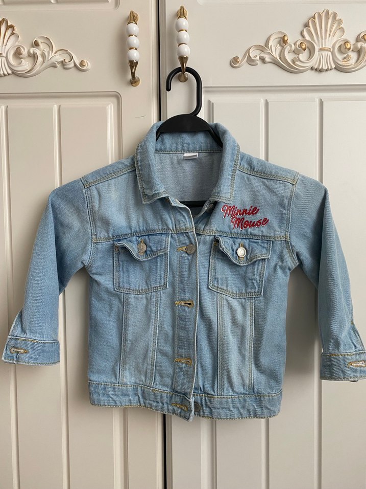Fitted kesim mavi kot ceket, düğmeli ve notlu yaka detaylıdır. Nakışlı Minnie Mouse figürüyle trend sokak stili için uygundur.