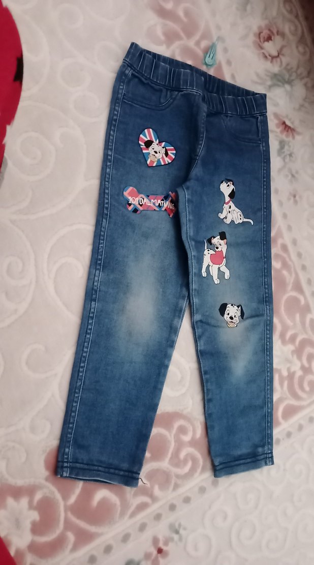 Nakışlı köpek desenleri ve düğme detaylı, dar kesim mavi kot kız çocuk pantolonu.