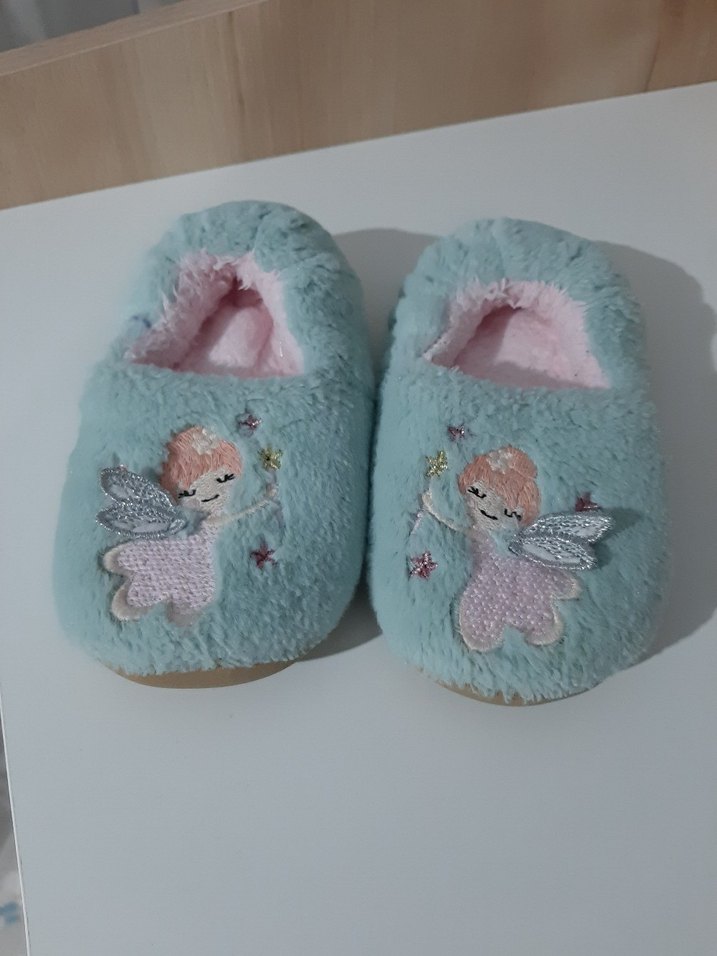 Nakışlı peri desenli, yumuşak mavi örgü kız çocuk ev patiği. Çok az kullanıldı yeni gibi