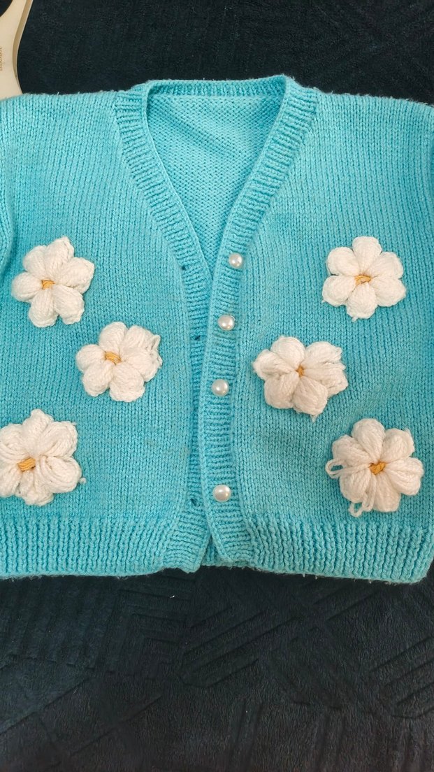 Fitted kesim mavi triko kız çocuk hırkası, uzun kollu ve renkli nakışlı çiçek detaylarına sahiptir. Bohem tarzda, inci düğmeli.el ormesı sayılı kullanıldı.