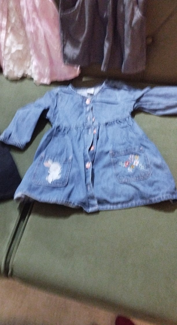Mavi denimden yapılmış, uzun kollu, yakası kesimli ve düğmeli kız elbisesidir. Ceplerinde nakış detayları bulunur, rahat kesimiyle trend bir görünüme sahiptir.