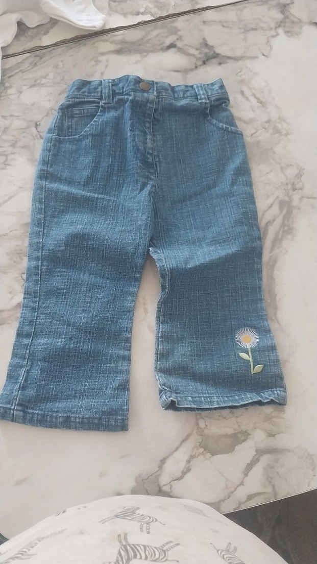 Düğmeli, bol kesim mavi denim kız pantolon, küçük nakışlı çiçek detayıyla rahat ve günlük tarzda.