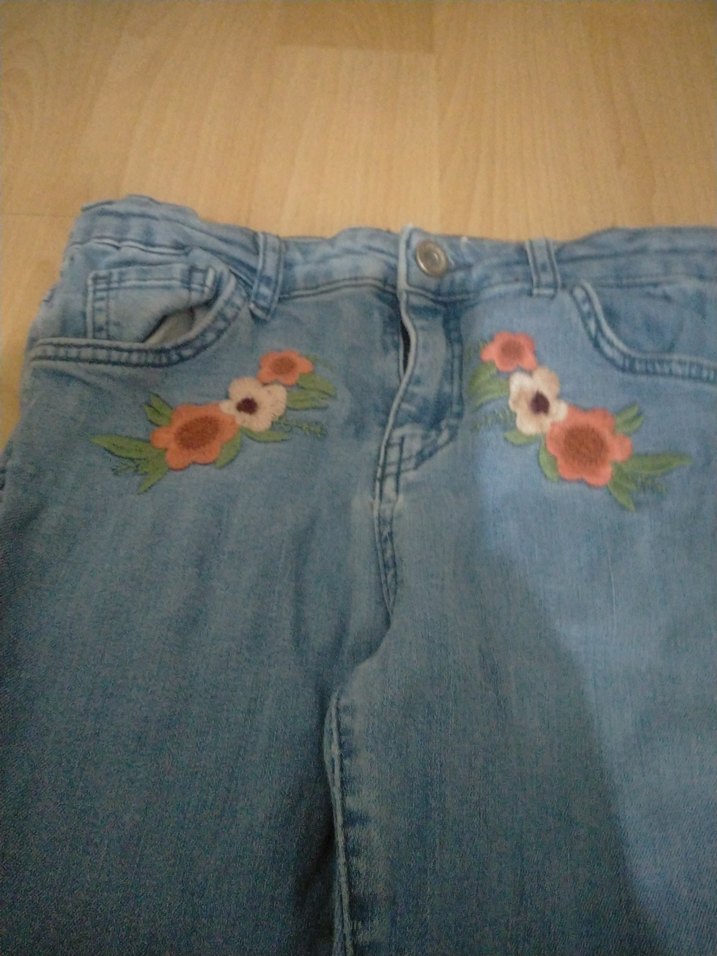 Nakışlı çiçek detaylı mavi kot kız pantolonu, bol kesim ve düğmeli, rahat sokak stili için uygun.