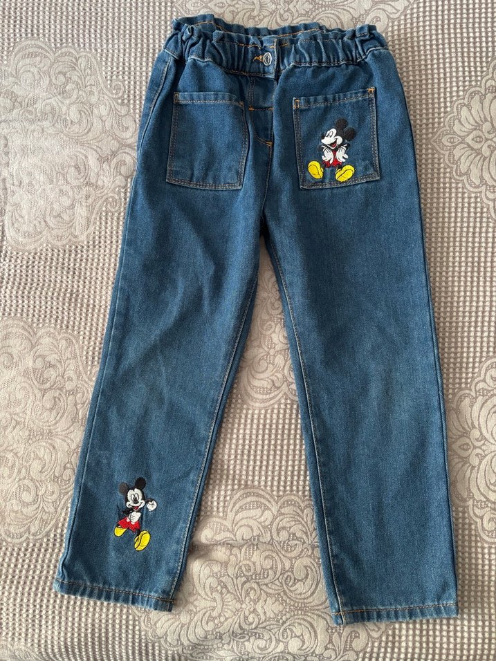Rahat kesim mavi kot pantolon, renkli nakışlı Mickey Mouse desenleri ve düğmeli kapanış ile sokak stili için uygun.