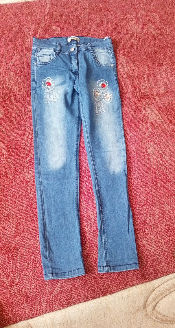 Nakışlı renkli detaylara sahip mavi kot pantolon. Düğmeli ve regular fit kesimiyle sokak modasına uygun rahat bir seçenek. boy 83 cm