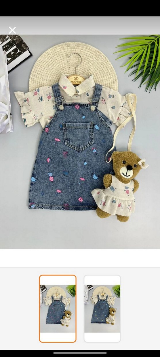 gömlek+kot elbise+ ayıcık 4 yaş sıfır ürün Nakışlı çiçek desenli, askılı mavi kot elbise, rahat kesim ve dantel detaylı. Bohem tarzda, oyuncak ayıcık aksesuarı ile birlikte.
