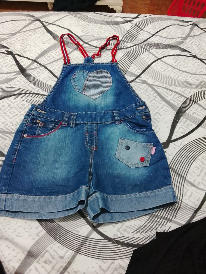 Rahat kesim, askılı mavi kot şort salopet. Nakışlı kalp deseni ve tokalı askılarla renkli detaylar. Sokak stili için uygun.