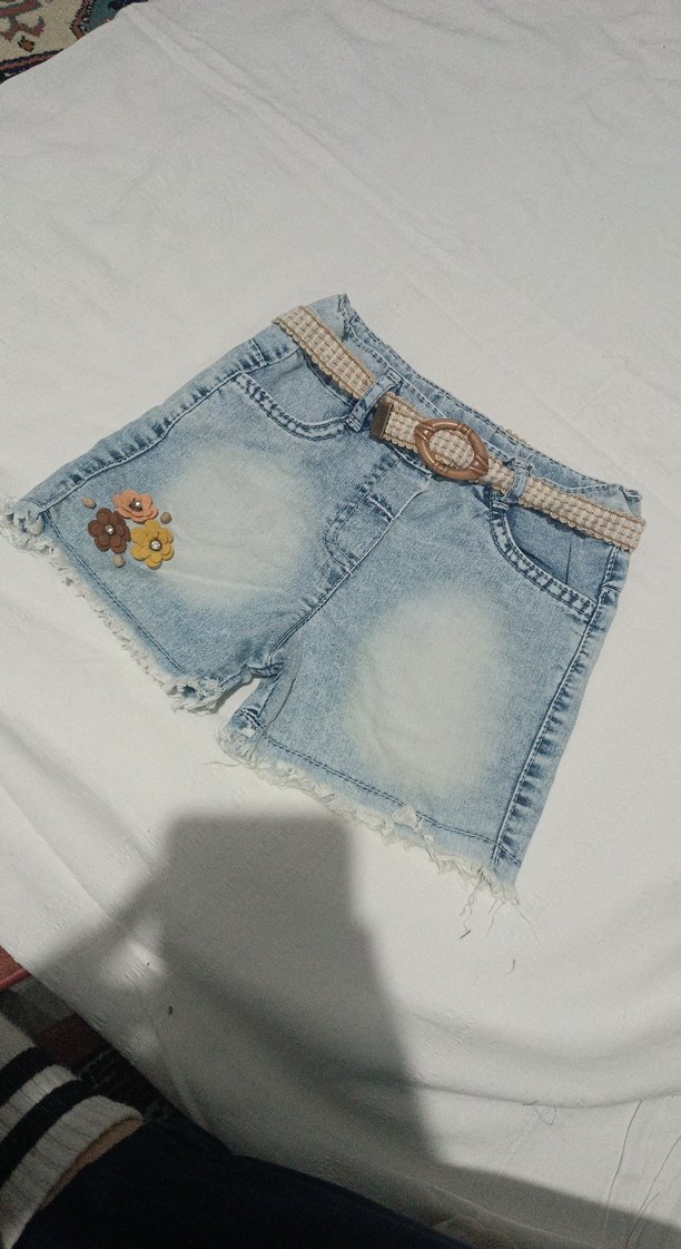 Rahat kesim mavi kot şort, renkli nakışlı çiçekler ve tokalı kemerle trend sokak stili için uygun.