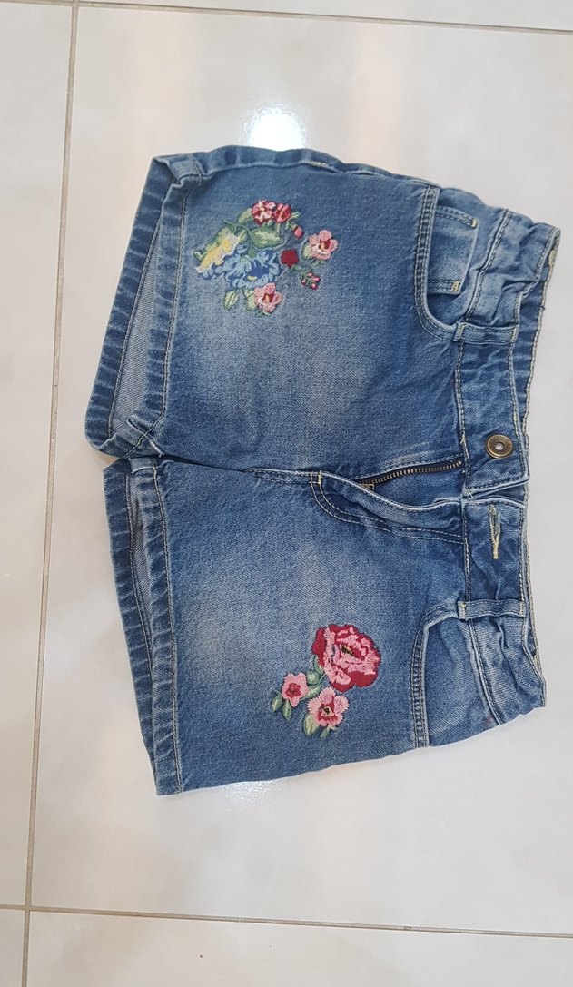 Canlı renkli nakışlı çiçek desenleri, düğmeli kapama ve bol kesimiyle mavi kot şort.