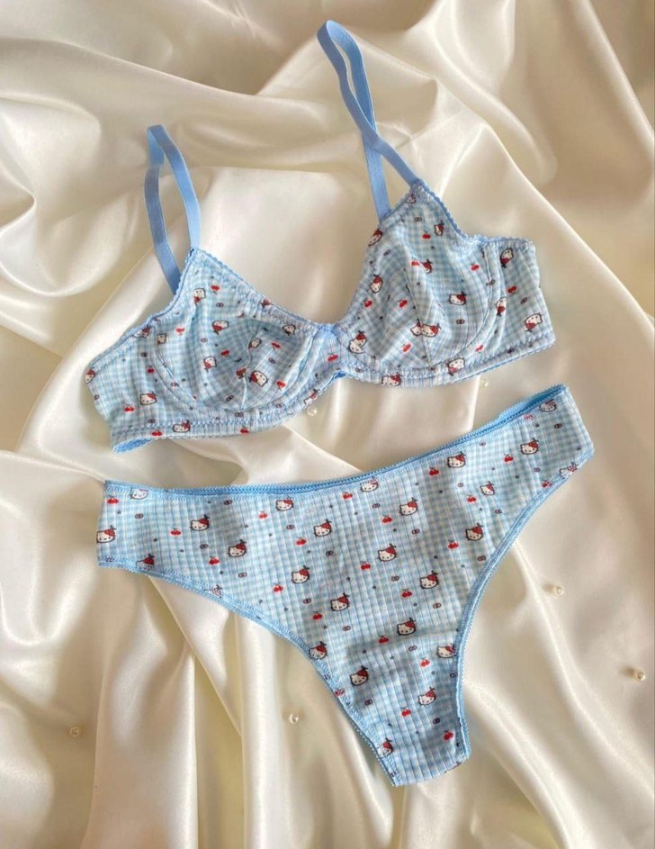 Nakışlı detaylara sahip pastel mavi sütyen ve bikini takımı, midi boyda ve Paris sokak modasından esinlenmiştir. Kumaş yumuşak kareli desene sahiptir.