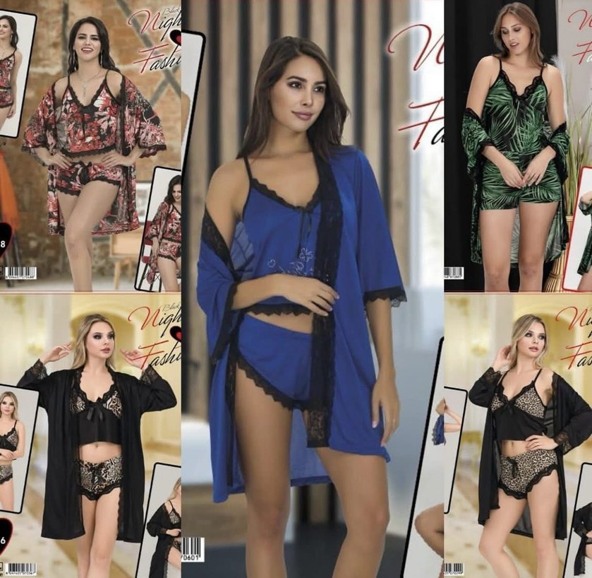 Kadınlar için nakışlı, bol kesim mavi mini askılı pijama üstü ve şort takımı, dantel detaylı hafif sabahlık ile birlikte. Rahat ve modern tasarım.