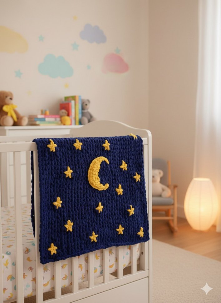 Koyu mavi renkli örgü bebek battaniyesi, sarı nakışlı yıldızlar ve ay figürü ile süslenmiştir.