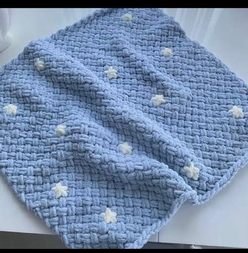 Nakışlı yıldız desenli, pastel mavi renkli yumuşak örgü çocuk battaniyesi. Çocuklar için sıcaklık ve konfor sağlar.