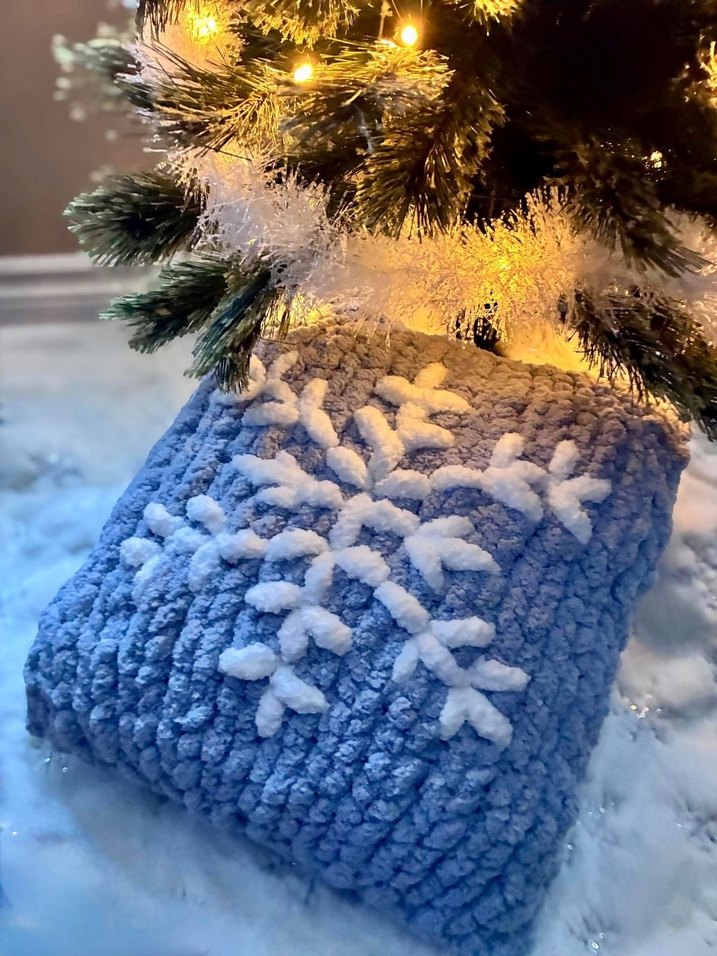 Mavi renkte, yumuşak örgü kumaştan yapılmış, beyaz nakışlı kar tanesi desenli çocuk battaniyesi. ❄️80*80