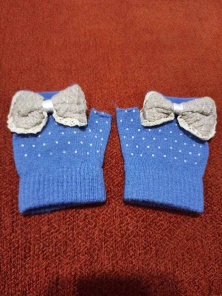Nakışlı detaylara ve süslü fiyonk aksesuarına sahip renkli mavi örgü cocuk eldiveni, sokak modası stilini yansıtıyor. marka temsilidir