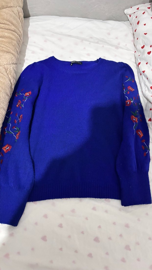 Mavi renkli, uzun kollu, nakış detaylı örgü kadın kazak. Yuvarlak yaka ve bol kesim ile rahat bir görünüm sunar. Günlük kullanıma uygun rahat bir parça.