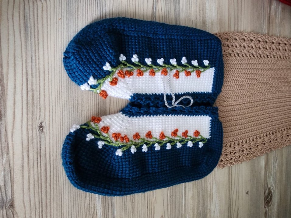 Mavi taban üzerine renkli nakışlı çiçek desenleriyle örülmüş kadın terlikleri, günlük rahat kullanım için uygundur.