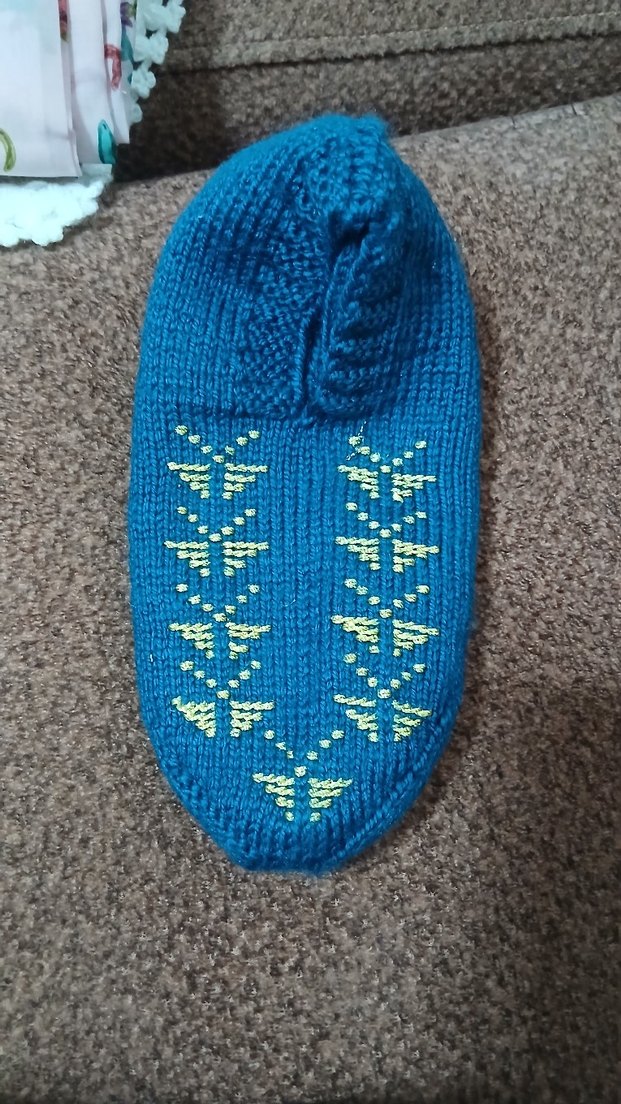 Örgü mavi kadın patiği, nakışlı desenlidir. Örgü kumaştan yapılmış, sade ve klasik tarzdadır.