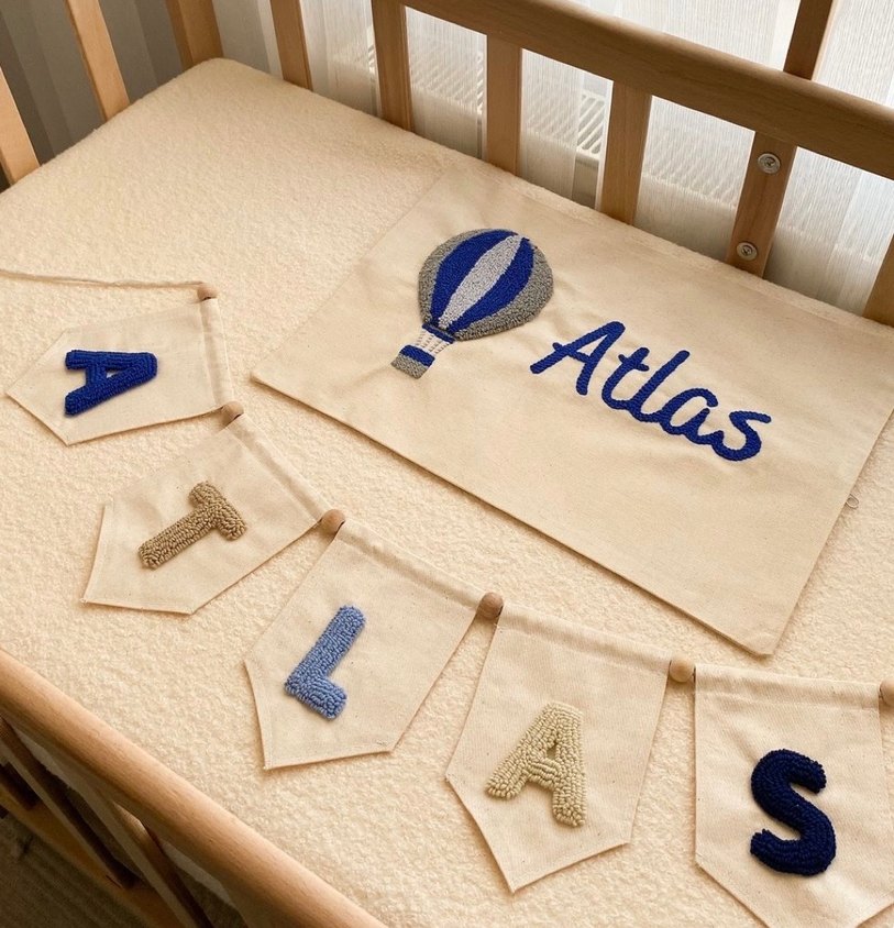 Pastel mavi pamuk kumaştan, nakışlı "Atlas" ismi ve sıcak hava balonu desenli bebek yatak aksesuarı. Harf başı fiyatı değişmektedir lütfen bilgi alınız