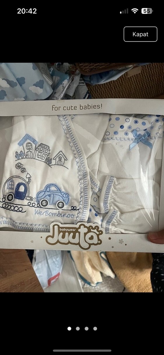 Nakışlı detaylara ve fırfırlara sahip mavi bohem tarzda pamuklu bebek erkek takımı. Kısa kollu ve straplez yakalıdır. Paket üzerinde 'For cute babies!' yazısı bulunur.
