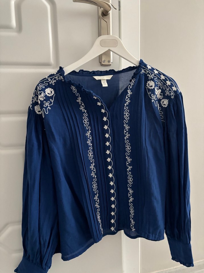 Koyu mavi pamuklu bluz, uzun kollu, düğmeli V yakalı ve beyaz nakış detaylıdır. Bohem tarzda, bol kesimdir.