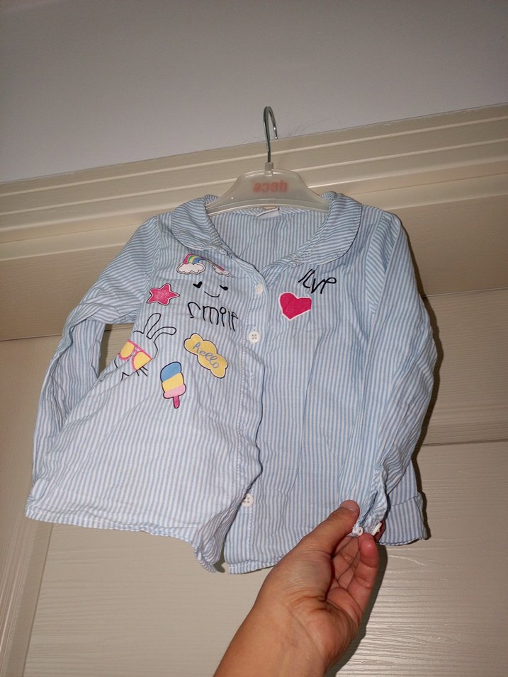 Pastel mavi pamuklu kız gömlek, uzun kollu, yakalı ve düğmeli. Renkli nakış detayları ile rahat ve trend sokak stili sunar.