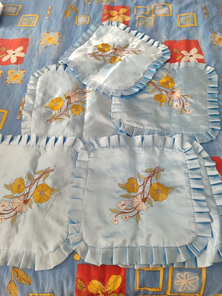 Konvansiyonel tarzda, pastel mavi renkli, çiçek işlemeli ve pileli kenarlı amerikan servis takımı. Sofranıza zarif bir dokunuş katar. ister masada kullanın ister koltuk kırlenti içini doldurup kullanın