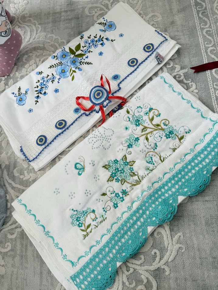 İki adet konvansiyonel havlu, pastel mavi nakışlı çiçek desenleri ve zarif dantel kenarlarla, yumuşak ve şık bir dokunuş sunar.