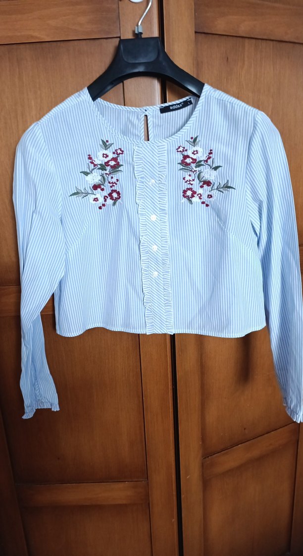 Mavi saten gömlek, uzun kollu, düğmeli ve ön kısmında çiçek nakışı bulunur. Bol kesim ve yakalı, günlük kullanım için uygundur.