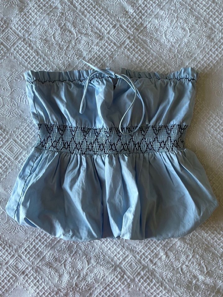 Nakışlı, mavi pastel renkte, belden büzgülü ve bağcıklı, midi boy ve vücuda oturanbluz. Yumuşak kumaştan üretilmiştir.