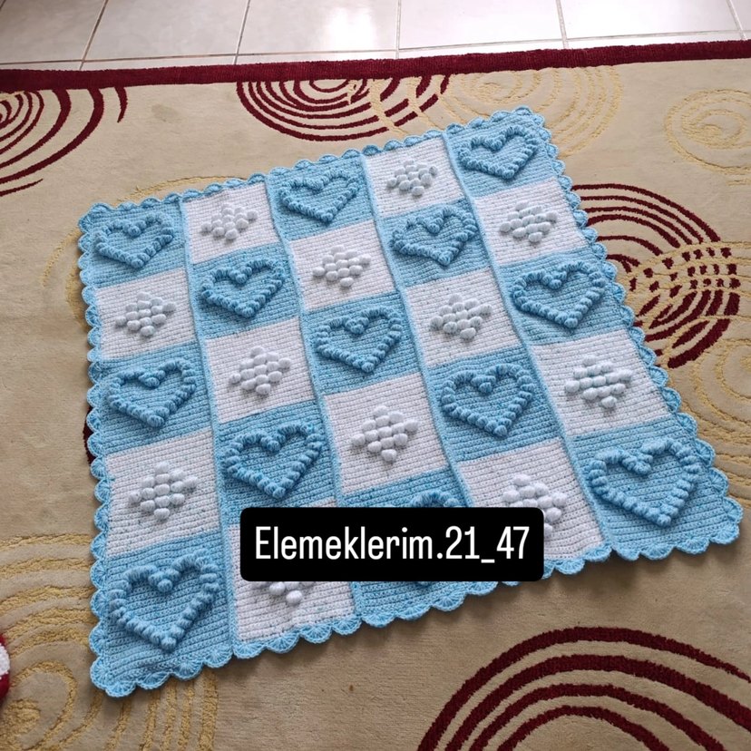 Nakışlı kalp ve dokulu desenlere sahip açık mavi triko bebek battaniyesi. Yumuşak ve rahat çocuklar için. el emeği bebe ipi ile örülmüş
