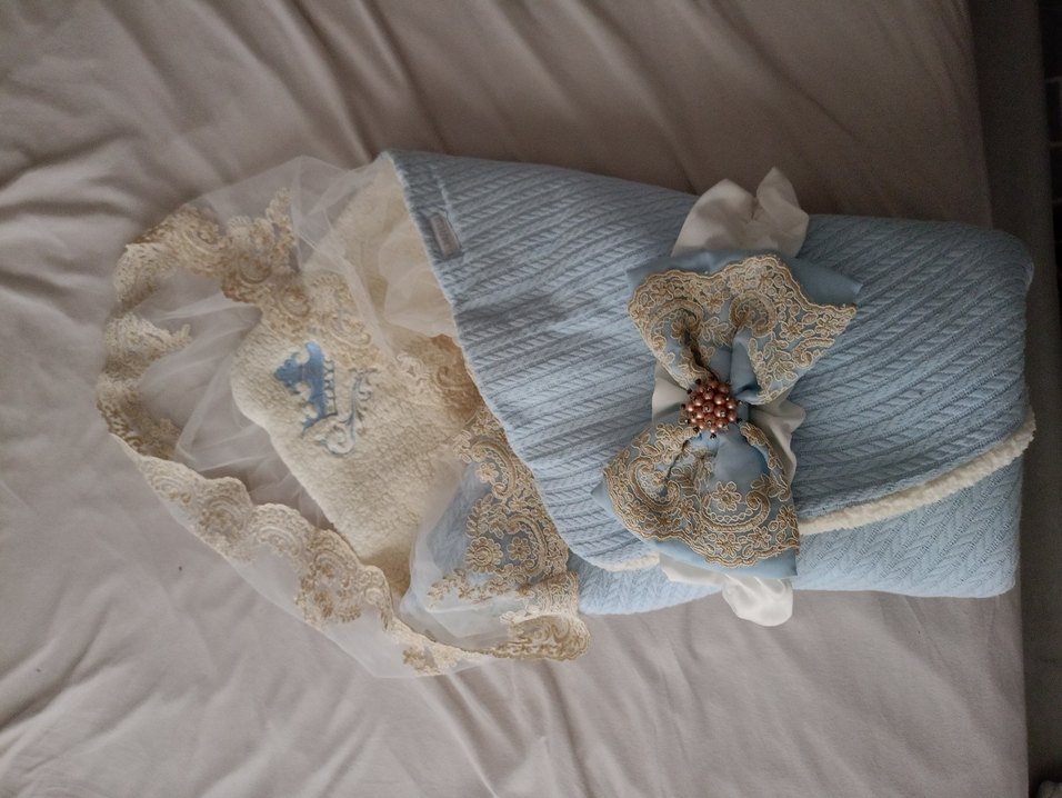 Pastel mavi triko bebek uyku baddaniye nakışlı desenler ve ince dantel detaylarıyla zarif ve yumuşak bir görünüm sunar. ️polarlı ve kalın